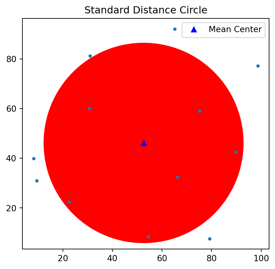 Plot mean center as well as the standard distance circle.
