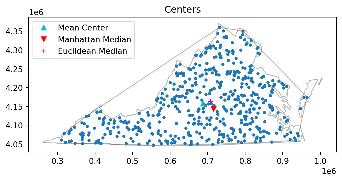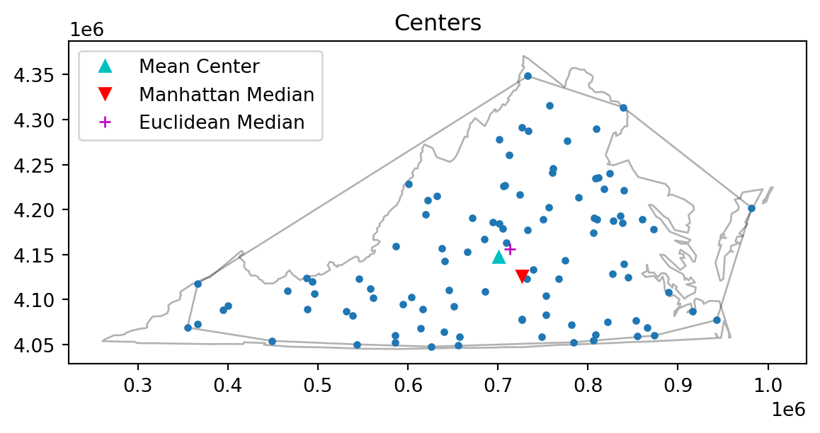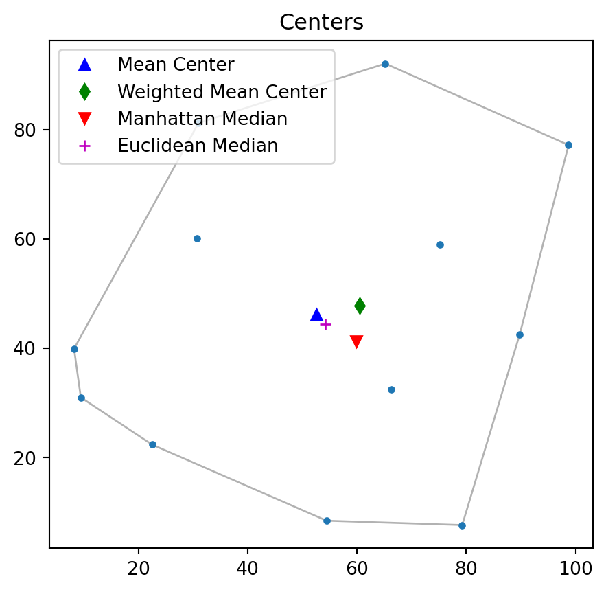 pp.plot(title='Centers', hull=True ) #plot point pattern "pp" as well as its convex hullplt.plot(mc[0], mc[1], 'b^', label='Mean Center')plt.plot(wmc[0], wmc[1], 'gd', label='Weighted Mean Center')plt.plot(mm[0], mm[1], 'rv', label='Manhattan Median')plt.plot(em[0], em[1], 'm+', label='Euclidean Median')plt.legend(numpoints=1)