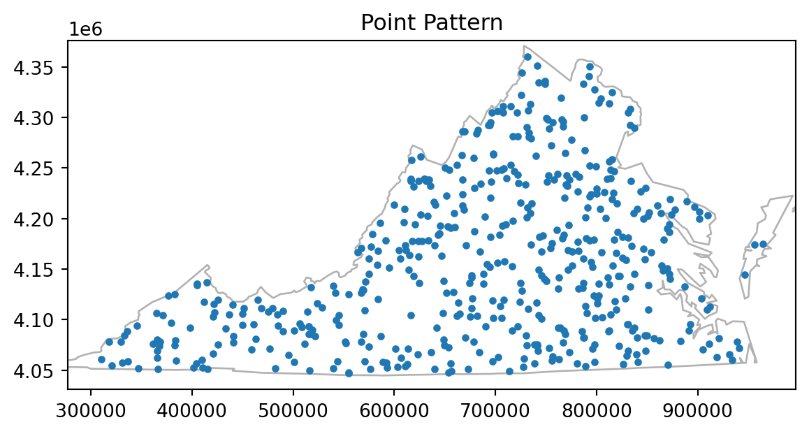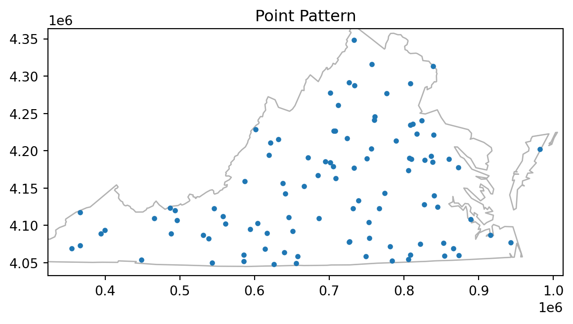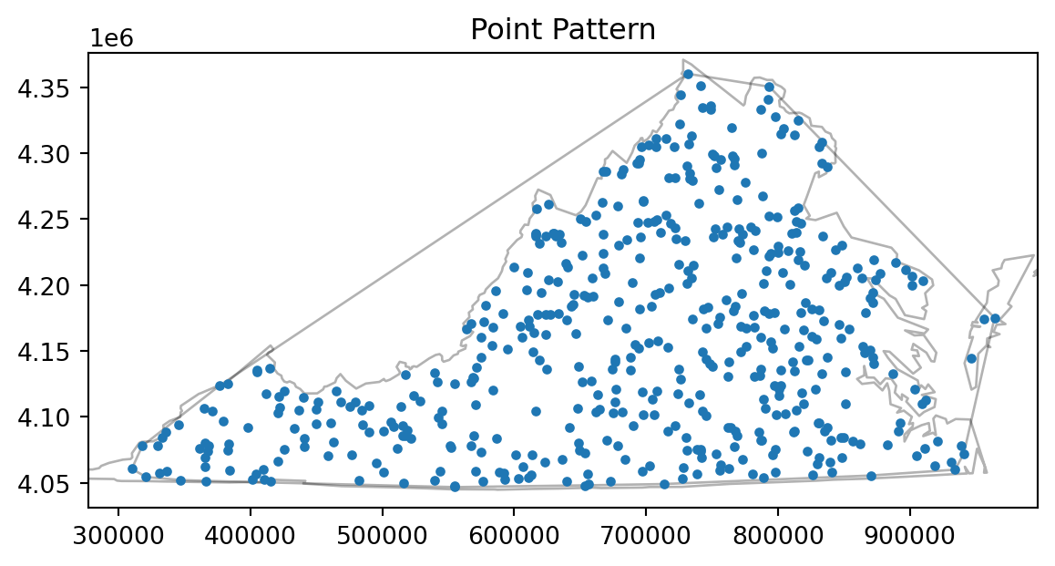 #from pysal.contrib import shapely_extfrom libpysal.cg import shapely_extfrom pointpats import PoissonPointProcess as csrimport libpysal as psfrom pointpats import as_window#import pysal_examples# open "vautm17n" polygon shapefileva = ps.io.open(ps.examples.get_path("vautm17n.shp"))# Create the exterior polygons for VA from the union of the county shapespolys = [shp for shp in va]state = shapely_ext.cascaded_union(polys)