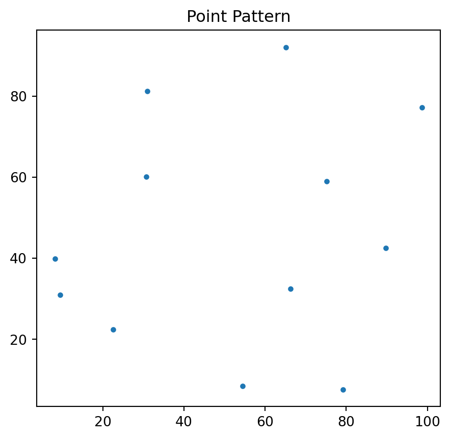 import numpy as npfrom pointpats import PointPattern%matplotlib inlineimport matplotlib.pyplot as pltpoints = [[66.22, 32.54], [22.52, 22.39], [31.01, 81.21], [9.47, 31.02], [30.78, 60.10], [75.21, 58.93], [79.26, 7.68], [8.23, 39.93], [98.73, 77.17], [89.78, 42.53], [65.19, 92.08], [54.46, 8.48]]pp = PointPattern(points) #create a point pattern "pp" from listpp.points