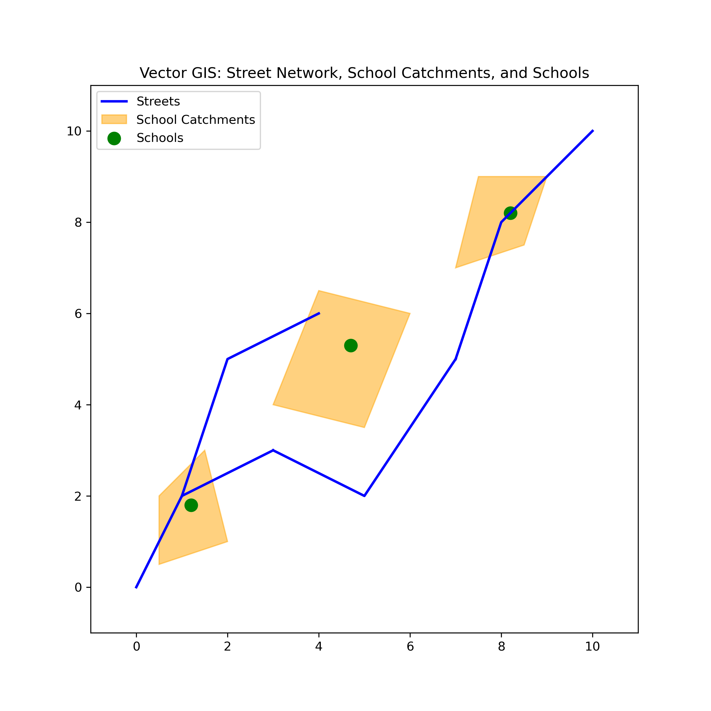 import matplotlib.pyplot as pltfrom matplotlib.patches import Polygon as MplPolygon# Data for streets (line strings)streets = [ [(0, 0), (1, 2), (3, 3)], [(3, 3), (5, 2), (7, 5)], [(7, 5), (8, 8), (10, 10)], [(1, 2), (2, 5), (4, 6)],]# Data for school catchments (polygons)catchments = [ [(0.5, 0.5), (2, 1), (1.5, 3), (0.5, 2)], [(3, 4), (5, 3.5), (6, 6), (4, 6.5)], [(7, 7), (8.5, 7.5), (9, 9), (7.5, 9)],]# Adjusting the data for one school per catchmentschools = [(1.2, 1.8), (4.7, 5.3), (8.2, 8.2)]# Plotting the GIS map with one school per catchmentfig, ax = plt.subplots(figsize=(8, 8))# Plotting the streets with one legend entryax.plot(*zip(*streets[0]), color='blue', linewidth=2, label="Streets")for street in streets[1:]: street_x, street_y =zip(*street) ax.plot(street_x, street_y, color='blue', linewidth=2)# Plotting the catchments with legendfor i, catchment inenumerate(catchments): polygon = MplPolygon(catchment, closed=True, color='orange', alpha=0.5, edgecolor='black') ax.add_patch(polygon)if i ==0: polygon.set_label("School Catchments")# Plotting the schools (points) with one per catchmentschool_x, school_y =zip(*schools)ax.scatter(school_x, school_y, color='green', s=100, label="Schools")# Set the legend and titleax.legend()ax.set_title('Vector GIS: Street Network, School Catchments, and Schools')ax.set_xlim(-1, 11)ax.set_ylim(-1, 11)ax.set_aspect('equal')# Save the figure to a fileplt.savefig("vector.png", dpi=300)# Show the plotplt.show()