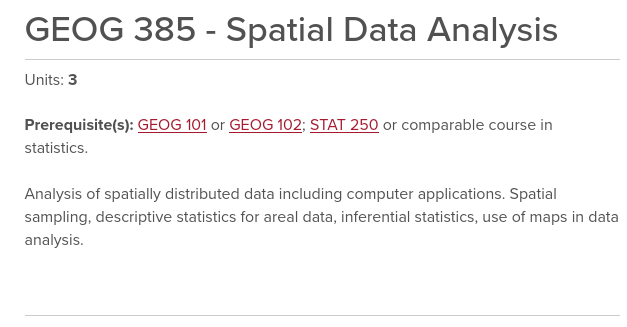 In the scope of a 15-week semester course we can only introduce a handful of the key concepts and methods relevant to the field of spatial data analysis. As such, the course is not intended as an exhaustive treatment. Instead, the goal is that students will acquire an understanding of the more common and useful methods and practices, and use the course as an entry point for further engagement with the field.